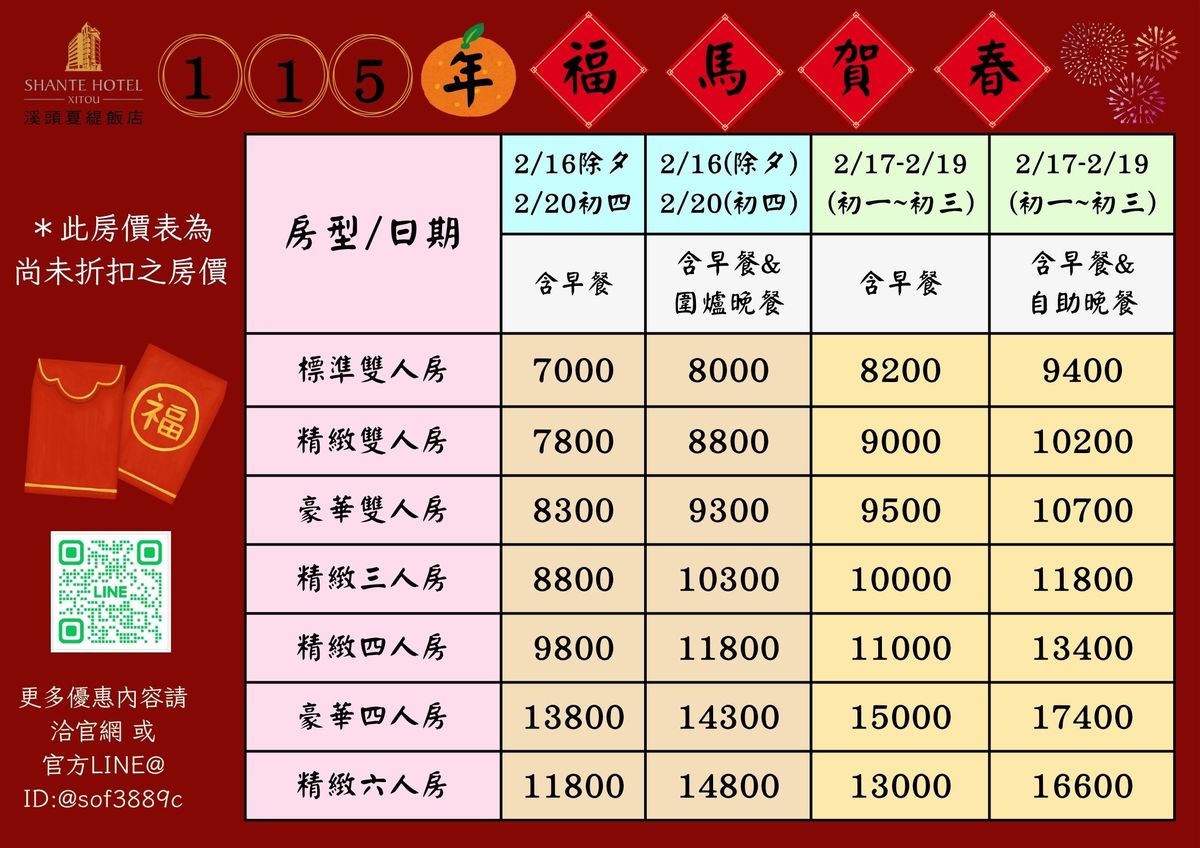 - 除夕團圓夜,當日晚餐為圍爐火鍋晚餐(17:30~19:30),初四供餐型式依當日現場公告。