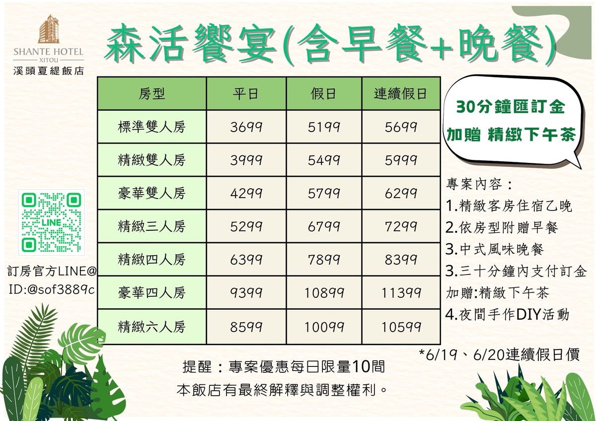 - 本專案每日限量10間;恕不適用旅行社及團體訂房,且不得與其他優惠方案合併使用,未使用之專案內容,恕不折讓或延至他次使用,飯店保留訂單成立與否之權利。