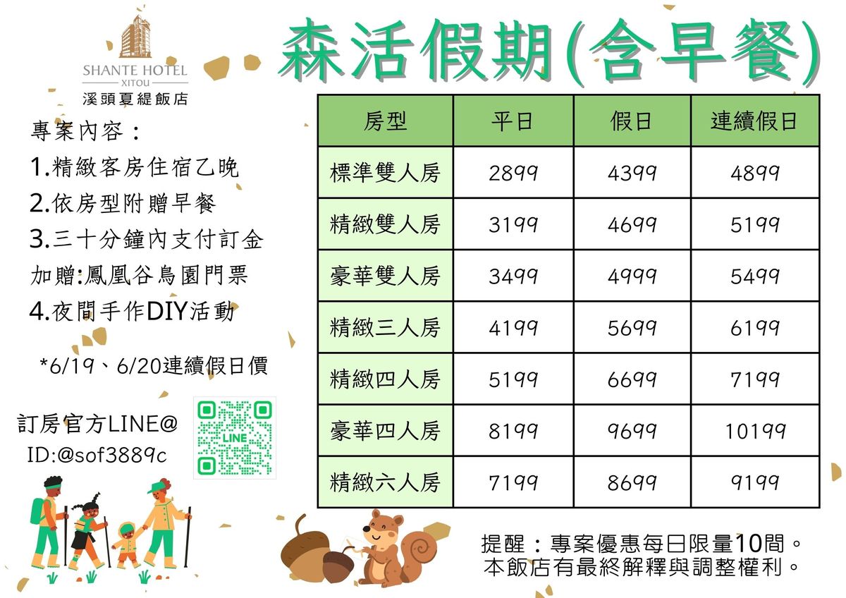 - 本專案每日限量10間;恕不適用旅行社及團體訂房,且不得與其他優惠方案合併使用,未使用之專案內容,恕不折讓或延至他次使用,飯店保留訂單成立與否之權利。